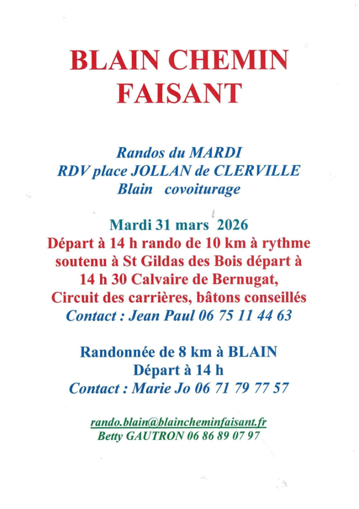 • Mardi 31 mars : Blain et St Gildas des Bois